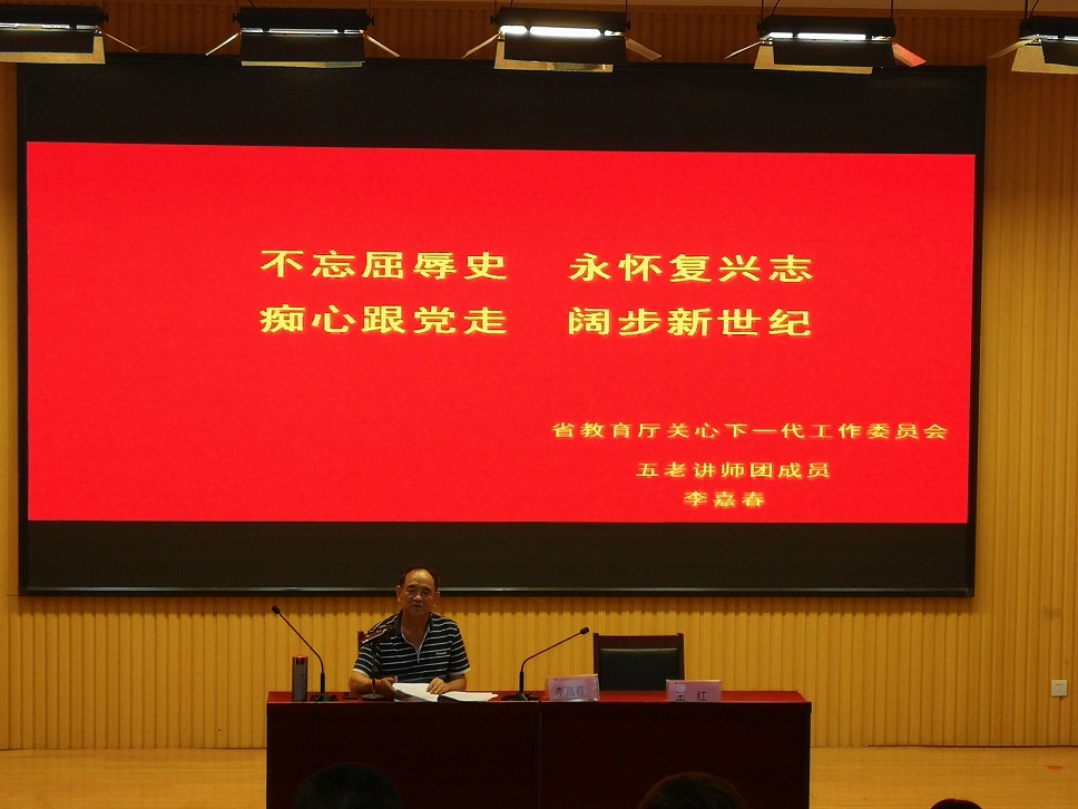 省教育厅关工委五老讲师团成员,学院退休教师、关工委成员李嘉春受邀做了题为“不忘屈辱史,永怀复兴志,痴心跟党走,阔步新世纪”的报告。团委学生工作处、组织人事处相关人员以及学生代表共160余人聆听了报告。