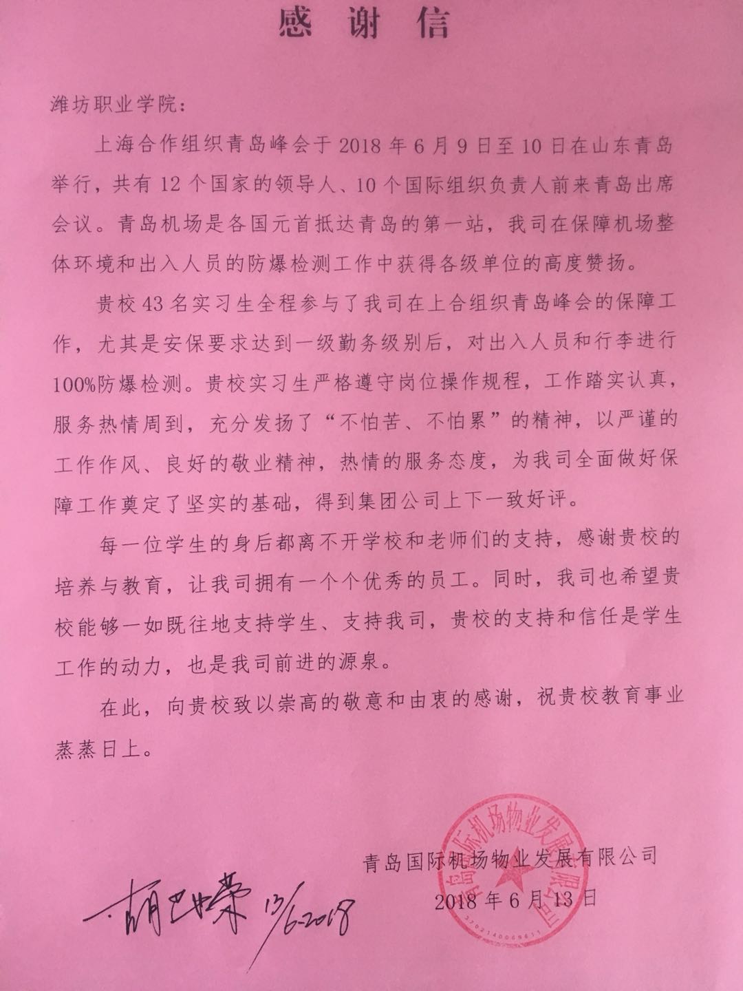 经过前期两周的适应期,学生们在6月份青岛上合峰会召开期间,在工作岗位上以标准的动作、得体的举止、规范的语言等服务于每一位通过青岛机场的中外旅客,她们的出色表现为青岛上合峰会亮出了防爆安检的新名片,得到了机场领导和过往旅客的交口称赞,树立了机场安检的良好形象,也为76net必赢官网赢得了良好的社会口碑。(梁延安 李桂杰供稿)