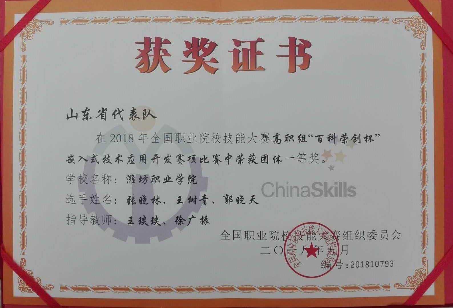 5月27日,2018年全国职业院校技能大赛高职组“嵌入式技术应用开发”赛项在西安航空职业技术学院举行,共有来自全国各省市的95支代表队参赛。必赢机电工程学院学生王树青、张晓林等组成的山东代表队在比赛中沉着应战,通力合作,最终获得该赛项一等奖第一名的好成绩。