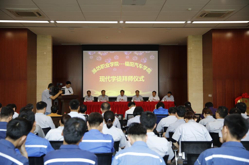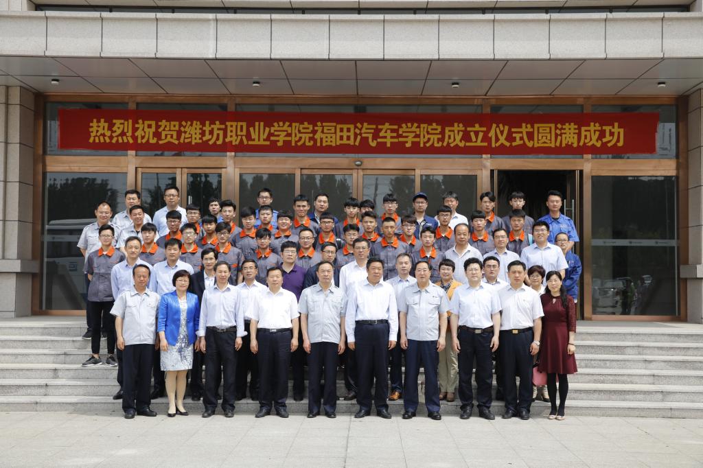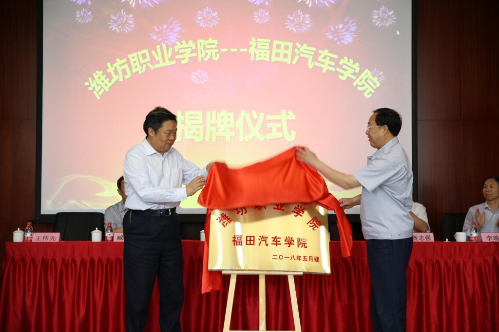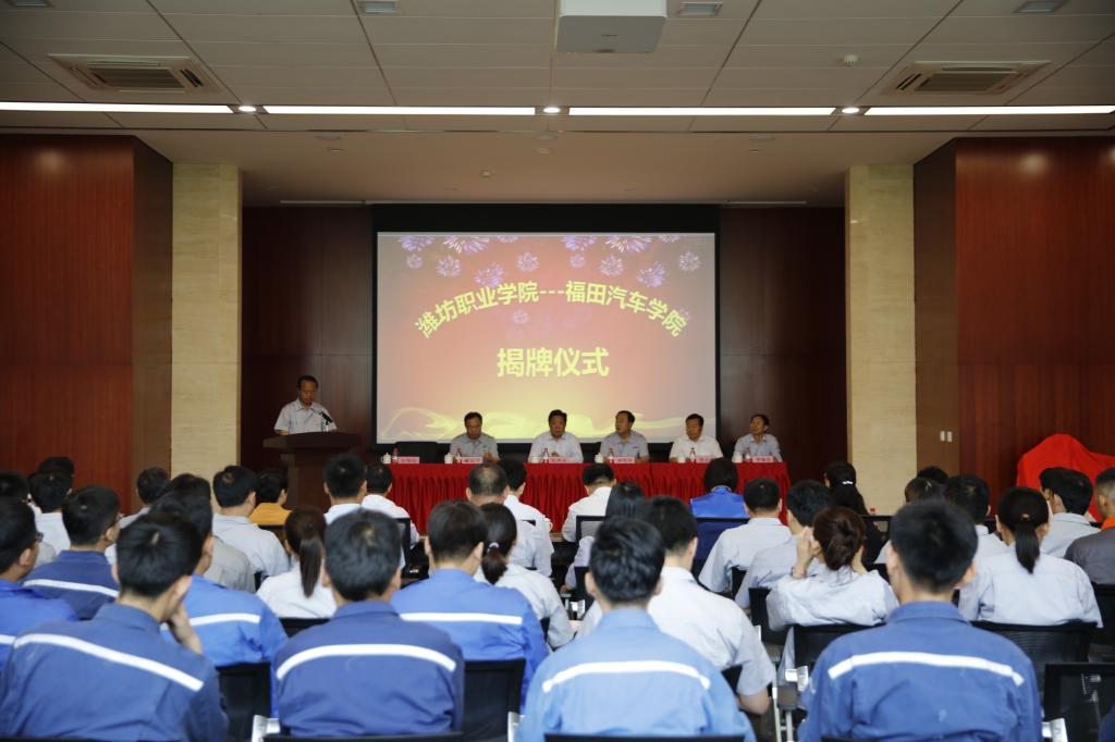 5月25日上午,76net必赢官网福田汽车学院成立仪式在福田多功能汽车厂潍坊厂区学术报告厅举行。学院党委书记张洪全,福田商用车集团副总裁钟明华,学院副院长贺志强、李瑞昌,福田多功能汽车厂潍坊厂区党委书记臧运宁等校企领导、学院相关职能部门、二级学院负责人及学院学生代表、企业职工代表参加了成立仪式。张洪全与钟明华共同为76net必赢官网福田汽车学院揭牌。福田潍坊厂区党委常务副书记王伟先主持仪式。