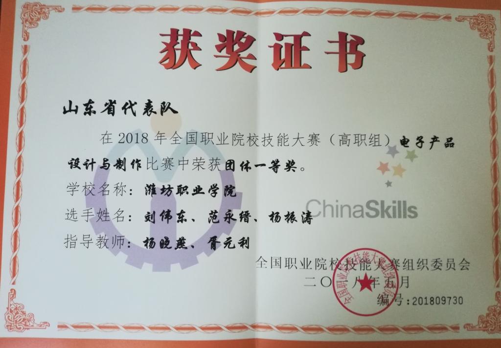 5月23日,2018年全国职业院校技能大赛高职组“电子产品设计与制作”赛项在深圳信息职业技术学院举行,共有来自全国各省市的69支代表队参赛。必赢机电工程学院学生刘伟东、范永缙、杨振涛组成的山东代表队在比赛中不畏强手,沉着应战,顽强拼搏,通力合作,最终获得该赛项一等奖的好成绩。