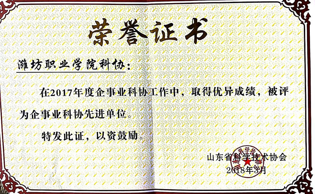 必赢获“2017年度山东省企事业科协先进单位”称号