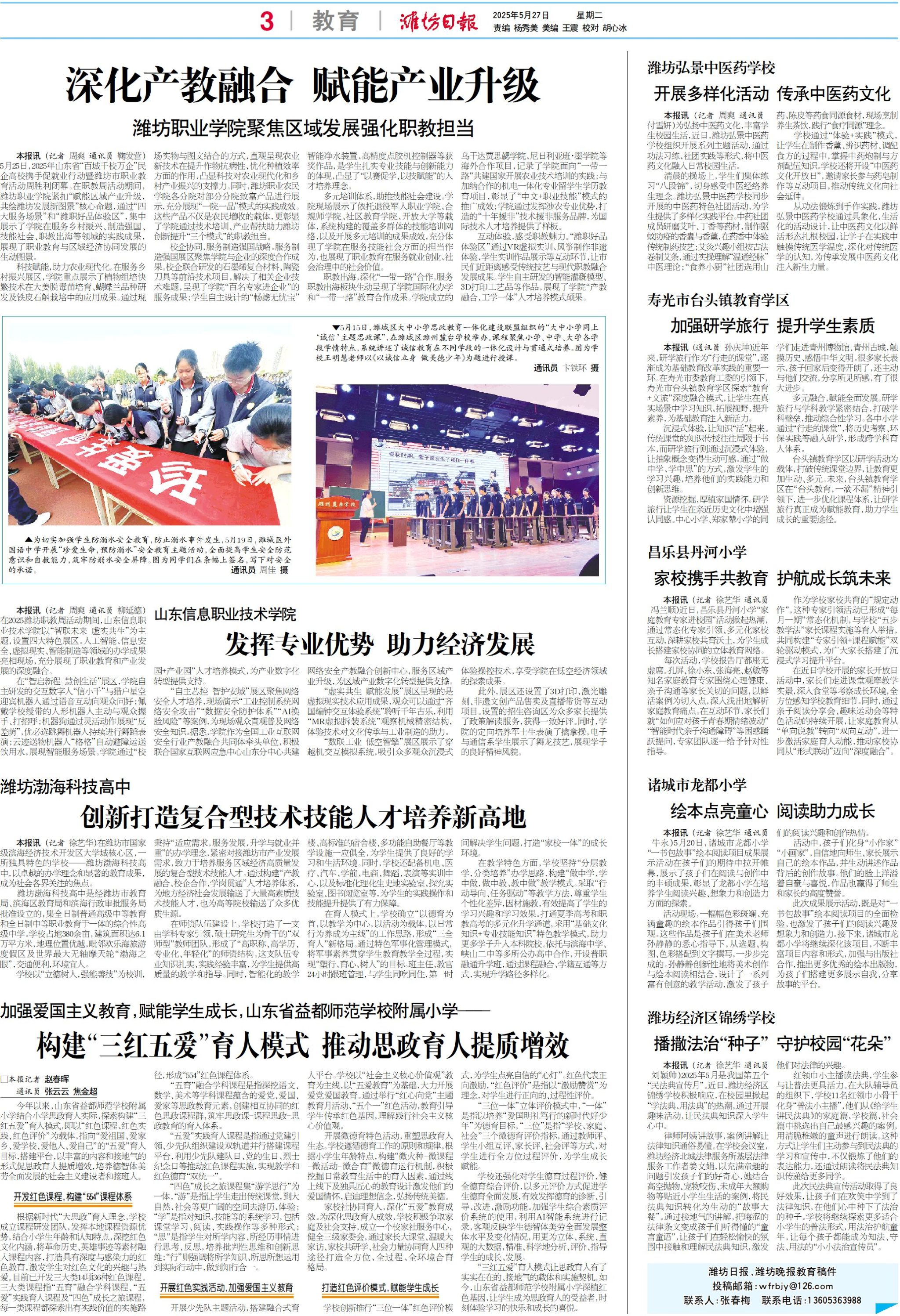 本报讯 (记者 周爽 通讯员 鞠发营)5月25日,2025年山东省“百城千校万企”民企高校携手促就业行动暨潍坊市职业教育活动周胜利闭幕。在职教周活动期间,76net必赢官网紧扣“赋能区域产业升级,共绘潍坊发展新图景”核心命题,通过“四大服务场景”和“潍职好品体验区”,集中展示了学院在服务乡村振兴、制造强国、技能社会、职教出海等领域的实践成果,展现了职业教育与区域经济协同发展的生动图景。