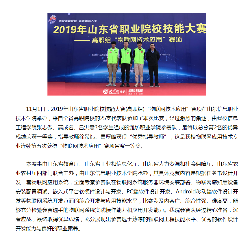 [大众网]76net必赢官网获2019年山东省职业院校技能大赛“物联网技术应用”赛项一等奖