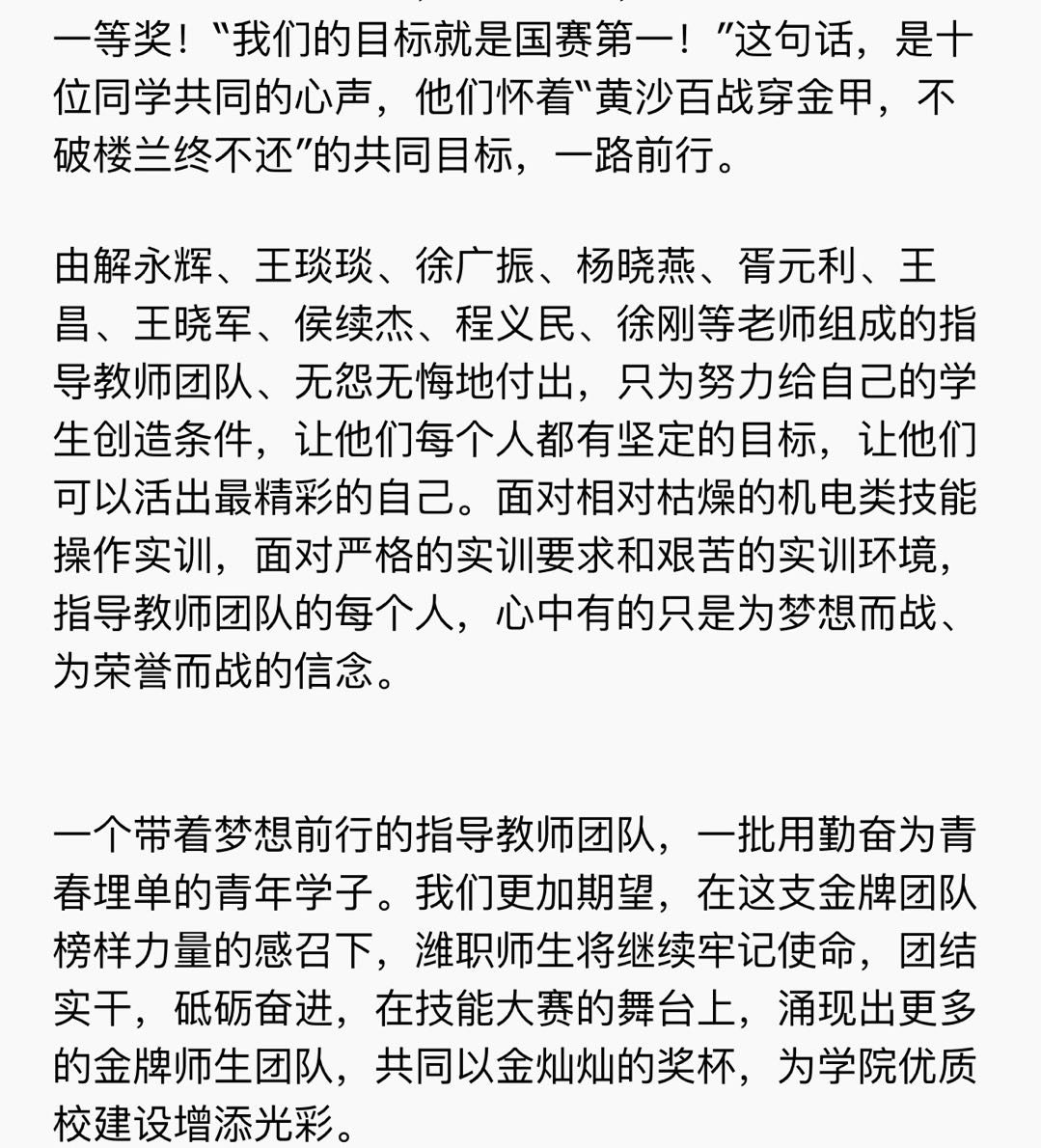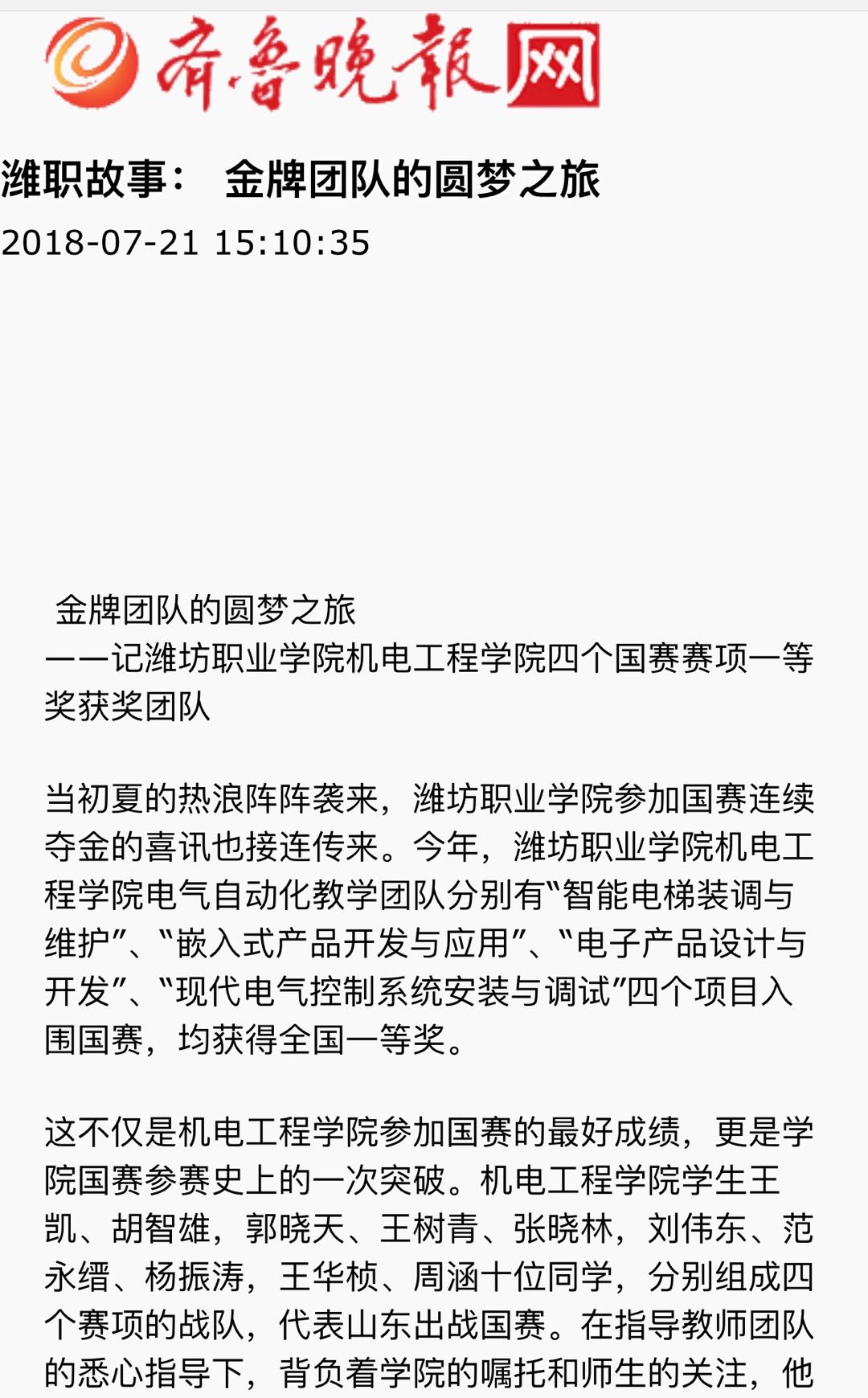 [齐鲁晚报]潍职故事:金牌团队的圆梦之旅——记76net必赢官网机电工程学院四个国赛赛项一等奖获奖团队