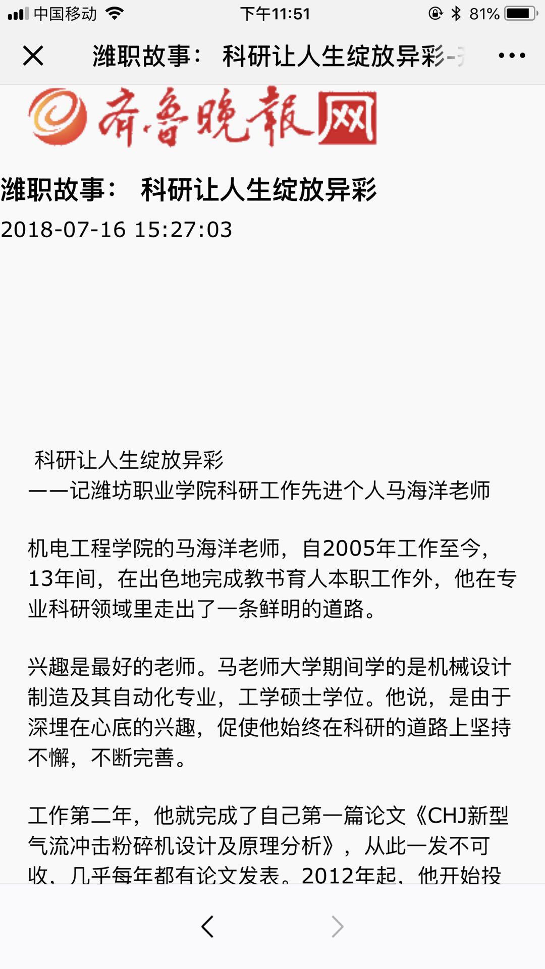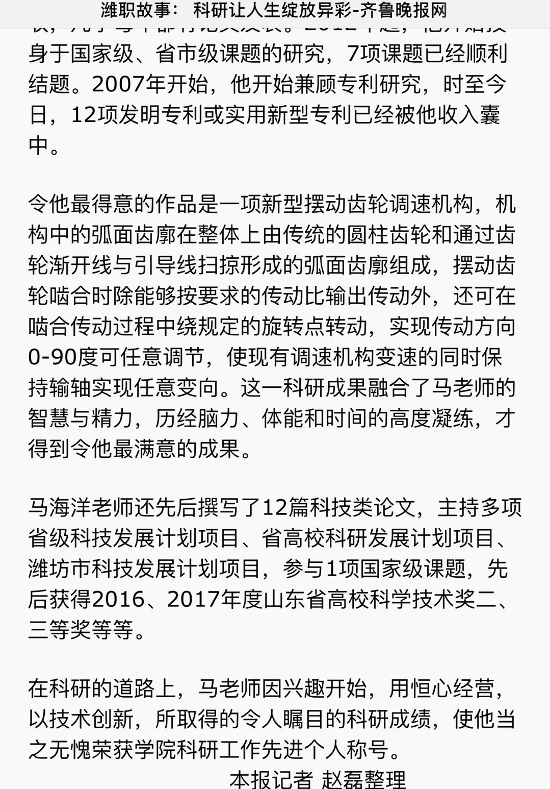[齐鲁晚报]潍职故事:科研让人生绽放异彩——记必赢科研工作先进个人马海洋老师