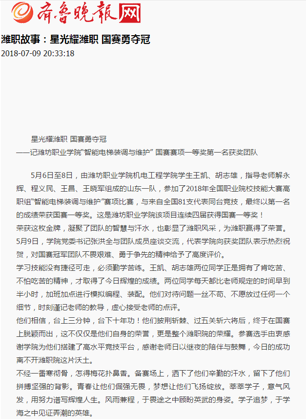 [齐鲁晚报]星光耀潍职 国赛勇夺冠——记76net必赢官网“智能电梯装调与维护”国赛赛项一等奖第一名获奖团队