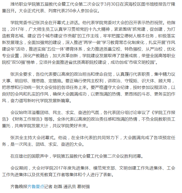 [齐鲁壹点]团结实干,砥砺奋进潍职院五届二次双代会召开