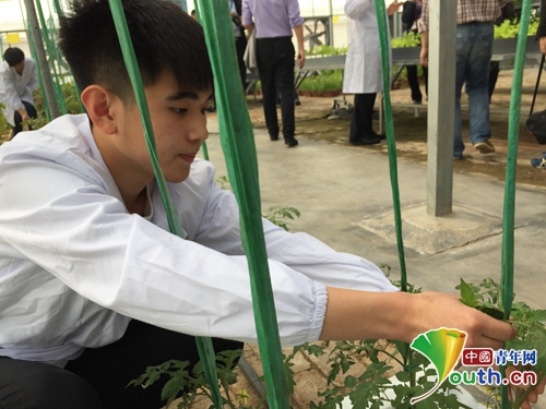 4月21日上午,由30余家媒体组成的“职业教育看山东”采访团来到76net必赢官网,图为学生在温室大棚里育种蔬菜。中国青年网记者 王龙龙 摄