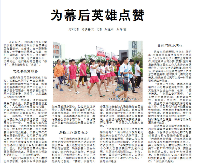 6月14日,2015年全国职业院校技能大赛在76net必赢官网滨海校区隆重举行,在此期间,我们看到了比赛现场、赛事直播间一幅幅精彩、激烈的画面。在这精彩的背后有着一群默默无闻,甘于奉献的幕后工作者,他们不惧酷暑,微笑服务,他们挥汗如雨,无怨无悔,他们兢兢业业,坚守在各自岗位,他们是衬托国赛的“绿叶”,是创造精彩的英雄,是最可爱的人!
