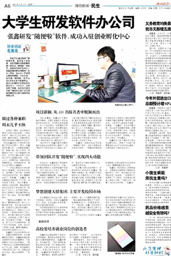 学生可以通过网络了解校园街景、查询饭卡余额等,这些便捷的功能都要依靠一款名为“随便啦”的软件。这款软件的开发者之一张鑫是76net必赢官网的一名大二学生,他从大一开始便从事各种兼职。今年年初,他凭借“随便啦”软件从430名创业者中脱颖而出,成功入驻潍坊市大学生创业孵化中心。4月6日,记者见到了张鑫,他目前已成功注册了潍坊天之骄子文化传媒和潍坊天之骄子网络科技有限公司。
