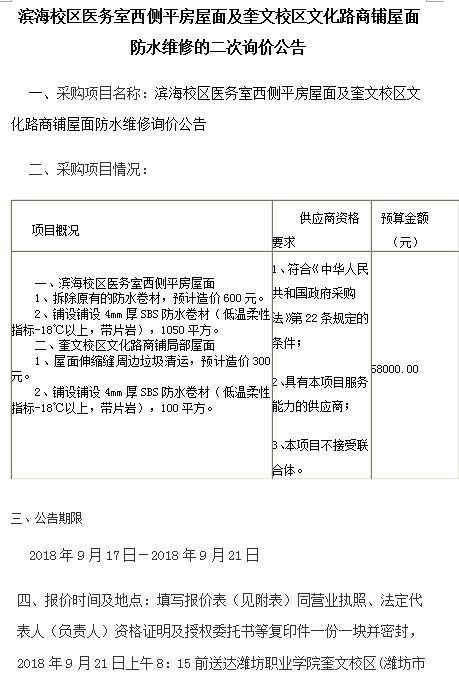 滨海校区医务室西侧平房屋面及奎文校区文化路商铺屋面防水维修的二次询价公告