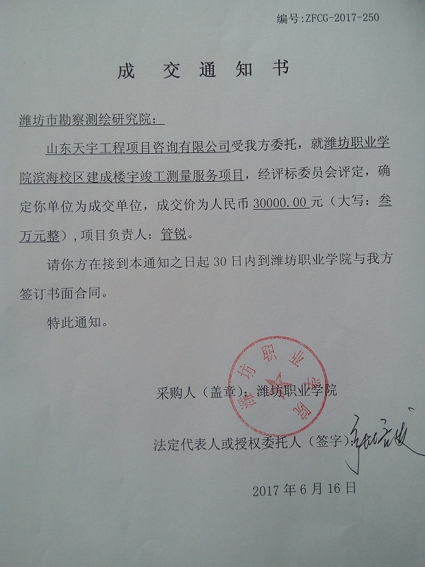 76net必赢官网滨海校区建成楼宇竣工测量服务项目成交通知书
