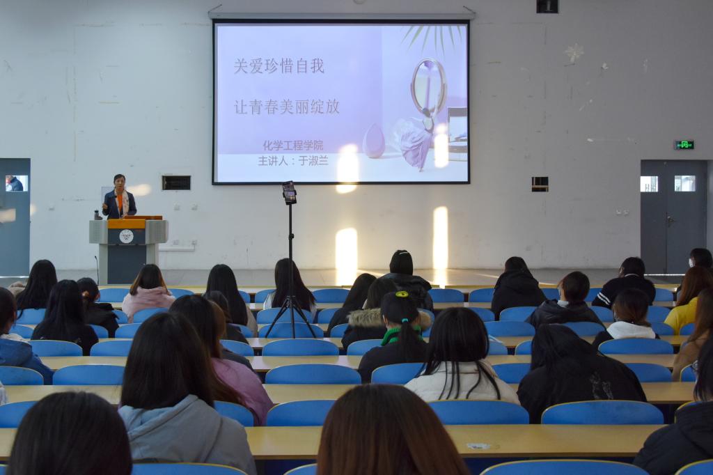 为了引导大学生树立正确的爱情观,正确对待生理和心理健康,加强自我保护防范、卫生防护意识,11月25日,化学工程学院举办“关爱珍惜自我,让青春美丽绽放”女生专题讲座,讲座邀请于淑兰老师主讲,化学工程学院全体女生参加讲座。