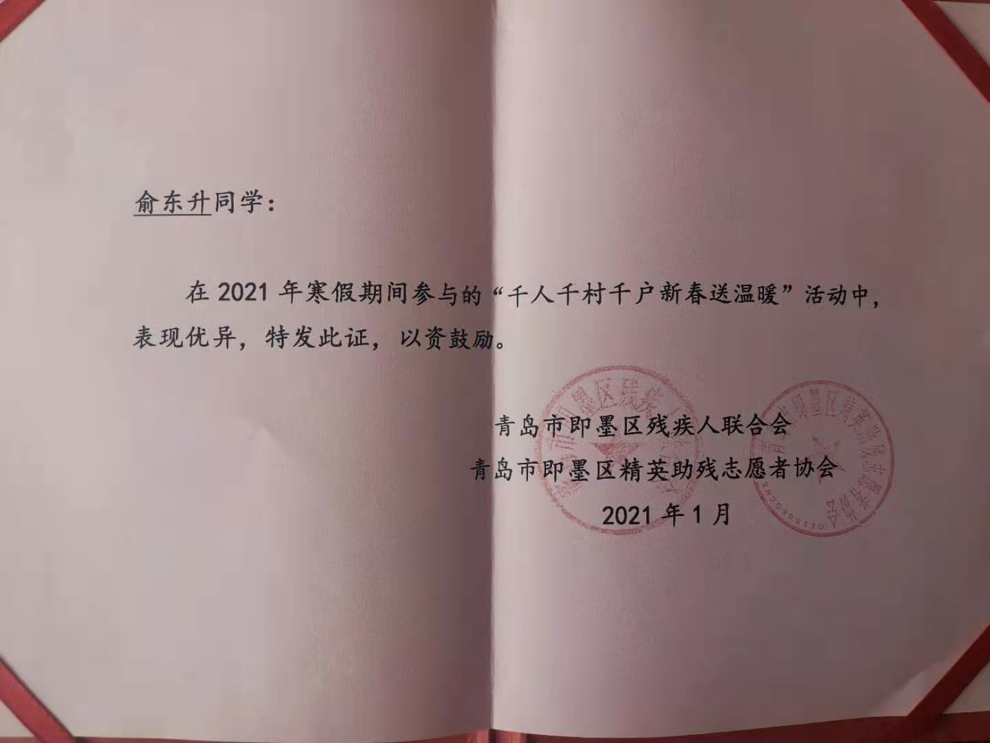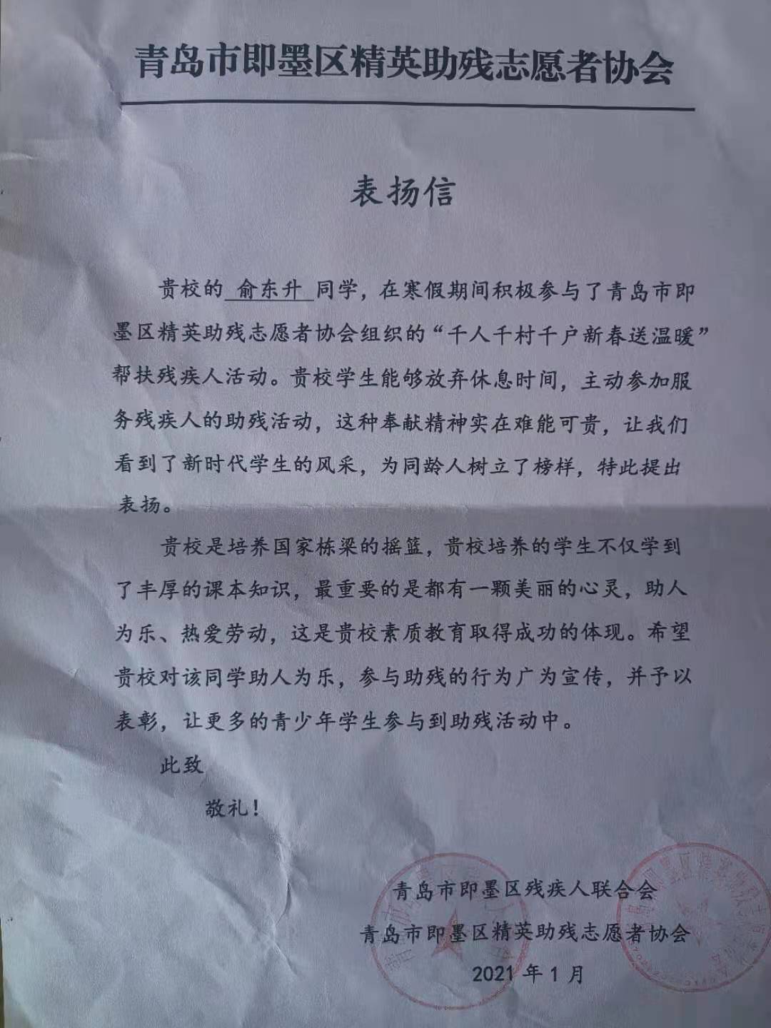 近日,机电工程学院收到了来自青岛市即墨区残疾人联合会的表扬信,表扬必赢2020级机电一体化技术五班的俞东升同学在寒假期间积极参与了青岛市即墨区精英助残志愿者协会组织的“千人千村千户新春送温暖”帮扶残疾人活动。