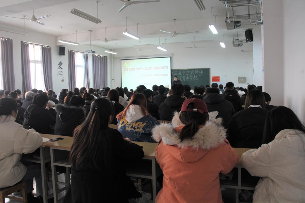 12月17日下午,信息工程学院组织全体入党积极分子、在校学生预备党员、各班级团支书惠泽二号楼A区412教室召开“放飞青春梦,奋进新征程”专题党课,学习党的十九届五中全会精神。在党课中,学生党支部负责同志给同学们讲解了十九届五中全会召开的重要意义,从五中全会召开的背景、五中全会的主要成果、规划《建议》的主要内容、全会释放的未来中国发展的重要信号等方面和同学们共同学习了五中全会的重要精神,还从五中全会与青年学生的关系、青春梦融入中国梦、高扬理想风帆争做“六有”大学生等方面引导青年学生把实现自身价值与服务祖国人民统一起来,把树立远大理想和进行艰苦奋斗统一起来。