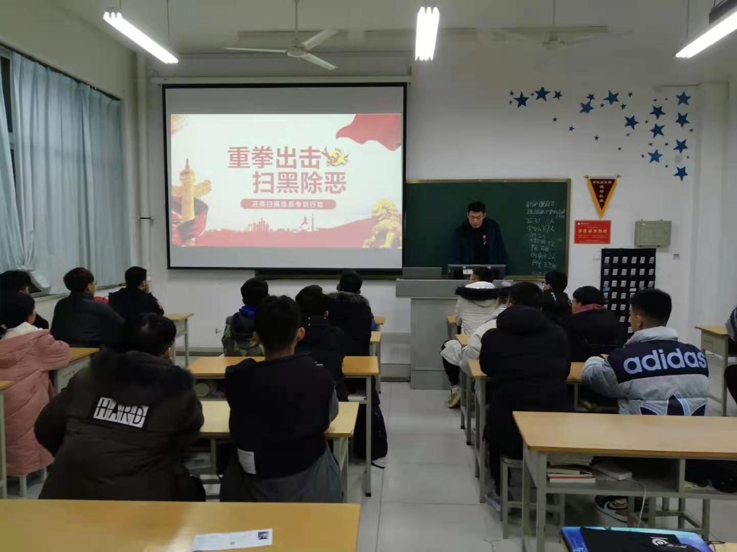 12月15日晚自习,信息工程学院组织专题班会,通过阅读《致广大市民朋友的一封信》和介绍自2018年以来,在为期三年的扫黑除恶行动中,展示较为典型的案例与大案、难案,宣传相关的法律法规,强化学生的法制意识,加强学生的自我保护。通过此次班会的开展,激发了同学们内心的正义感、社会责任感,夯实了扫黑除恶这个学生群体基础,使正确的人生观、价值观、世界观深入人心,同学们纷纷表达出对国家下狠手、下狠劲儿的做法积极靠拢,并继续向好向善。