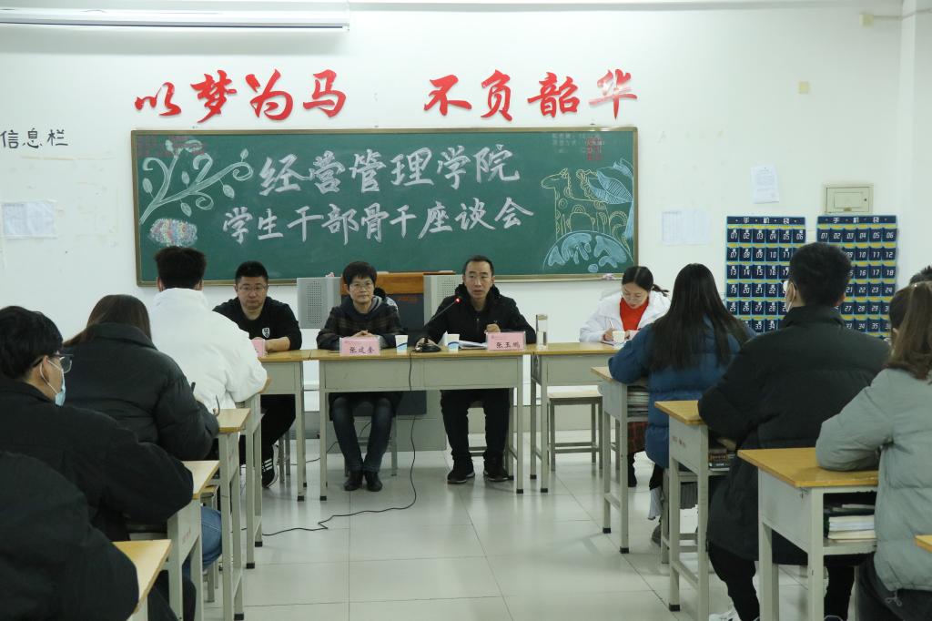 11月26日下午,经营管理学院在惠泽1号楼A214教室举行骨干学生干部座谈会。经营管理学院主要负责同志、辅导员办公室主要负责同志及45名学生干部代表参加了座谈会,经营管理学院党总支负责同志主持会议。