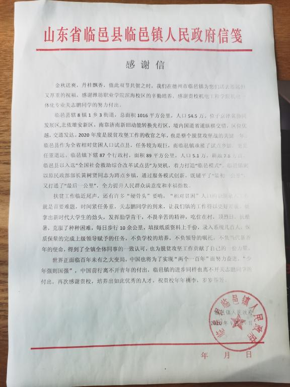 近日,机电工程学院收到德州市临邑镇人民政府发来的感谢信,对机电工程学院机电一体化专业关志鹏同学为当地扶贫工作做出的贡献表示感谢。