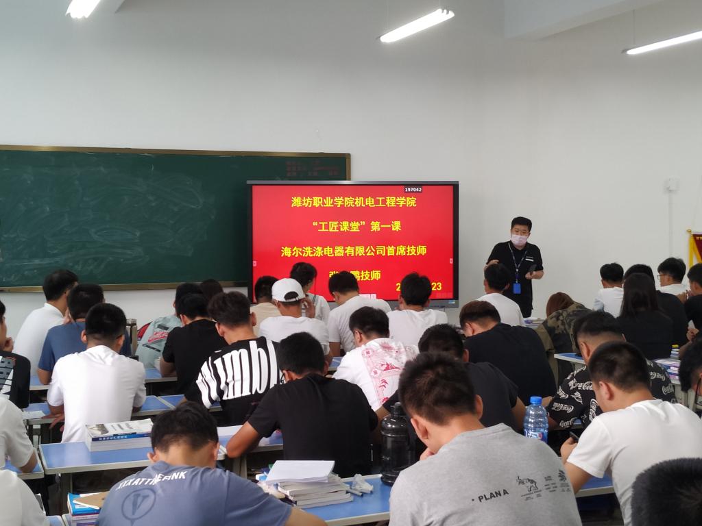 双方从现代学徒制实施的目的、意义,开展现代学徒制人才培养的规格、运行中的管理、双方在人才培养中各自扮演的角色进行了充分的交流。最后双方达成了校企实施“双班主任制”学生管理模式、每月实施“工匠、劳动模范进课堂”、合编新型教材等一系列措施保障。随后,山东省技术能手、青岛市劳动模范、第八届青岛市首席技师、青岛海尔洗涤电器有限公司洗衣机装配工张加鹏为机电工程学院的“工匠课堂”讲授第一课。张加鹏从自身经历讲述了如何从一名一线洗衣机装配工成长为山东省技术能手的经历。