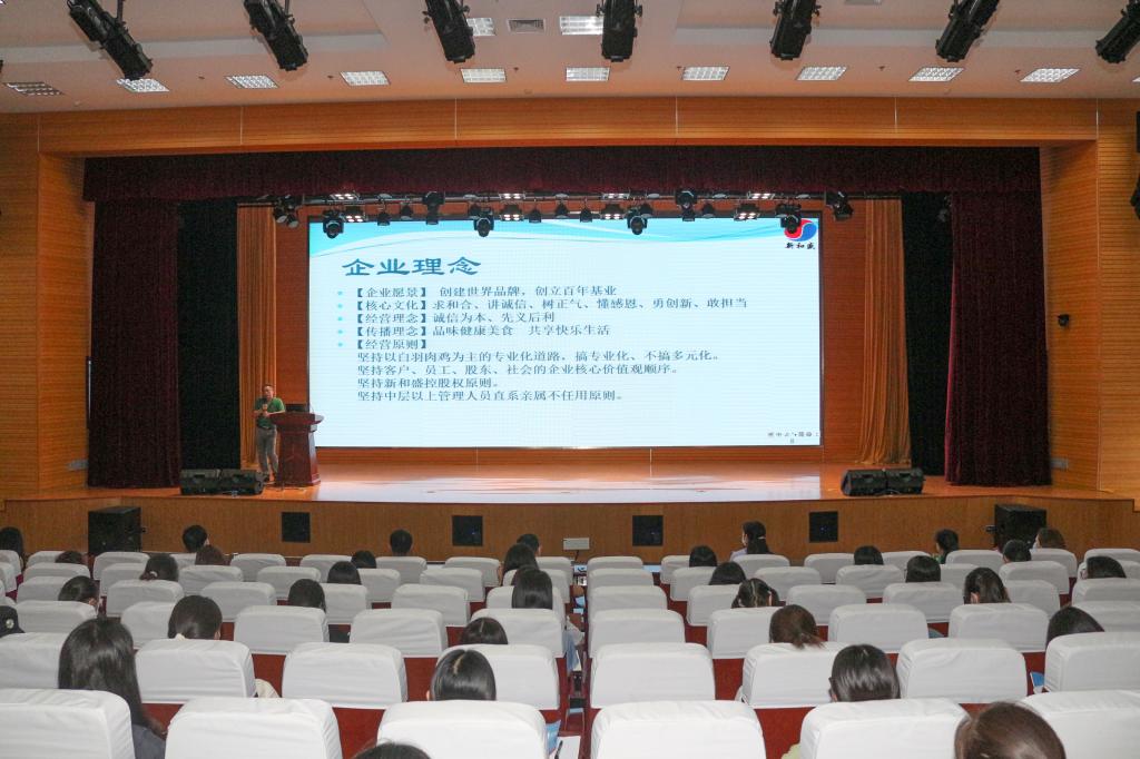 食品药品学院主要负责同志代表学院对山东新和盛农牧集团领导一行的到来表示欢迎,全场师生一同观看了新和盛农牧集团的企业宣传片。公司食品技术总监孙丽花从新和盛集团对国际连锁餐饮品牌和本土连锁餐饮品牌的产品供应两个方面介绍了新和盛的三大类产品;品控总监卢永盛介绍了企业愿景、核心文化、经营理念、传播理念、经营原则等方面的内容。公司总裁温海涛以“面对未来三十年的职场生涯,你准备了些什么”为题,为全场师生作了一场精彩的报告。温海涛从新和盛的企业文化、大学生的职业规划和人才培养等几个方面入手,结合个人的经历和新和盛集团的发展历程,为同学们讲解了新和盛的管理团队、核心竞争力、发展机遇和未来规划,使同学们深入了解了行业发展趋势和人才发展需求,为同学们日后的择业、就业提供了指导与帮助,现场气氛十分活跃。最后,必赢在新和盛集团就职的毕业生与即将踏入顶岗实习岗位的在校生进行了经验分享和交流。