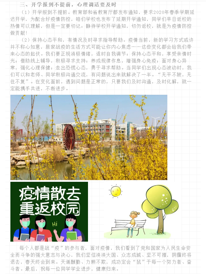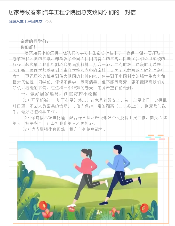 心理细关爱,居家候春来。“停课不停学“,面对在家“开学”,开展线上课的情况,团总支在线下了解到同学们存在着紧张焦虑等心理,通过“居家等候春来——汽车工程学院团总支致同学们的一封信”、心理防护小知识推送等有针对性地帮助同学们恰当应对、稳定心态,构建乐观平和的心态,以积极阳光心态面对新的学习和生活方式,让特殊时期的学习、生活变得“不特殊”,以饱满的精神状态投入到学习生活中。