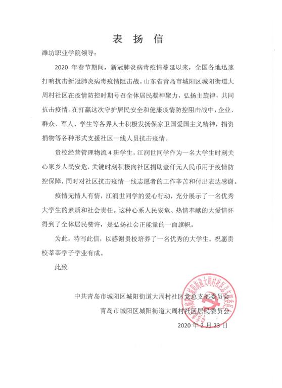 3月11日必赢收到来自中共青岛市城阳区城阳街道大周村社区一封特殊的表扬信,2019级物流管理四班江润世同学向社区疫情防控无偿捐款壹千元人民币。他捐款的数目虽不巨大,却承载了爱的力量。在同学们眼中,他是善于助人的好朋友,当同学们有困难的时候,他总会会尽自己所能的帮助。