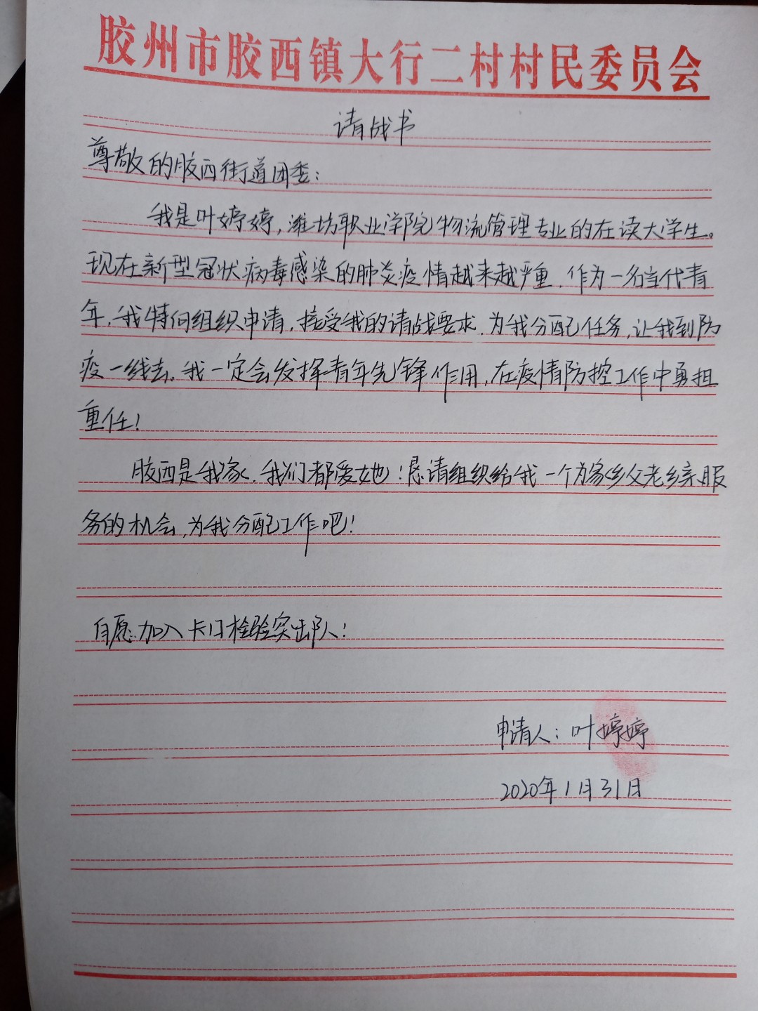 在这样一支庞大的志愿者队伍里,也有很多潍职经管青年的身影。有一分热,发一分光,远在各地的潍职经管人用不同的方式在此次抗疫行动中留下了爱与温暖,来自经营管理学院2018级物流管理1班叶婷婷同学就是其中的一员,1月31日她主动请战参加防疫工作,到村委会填写请战书,参加防控工作后,她每天在防控执勤点协助工作人员进行必要的信息登记和检测体温。他每天巡查村庄,对孤寡老人讲解疫情的相关知识,耐心做好小区人员的思想工作,告知在家隔离的必要性。对于有重要事情要外出的人员,她会反复叮嘱注意事项。“哪里需要,我就去哪里”在防疫工作中这是她的常态。她用自己的行动与责任感为抗疫行动贡献了自己的力量。