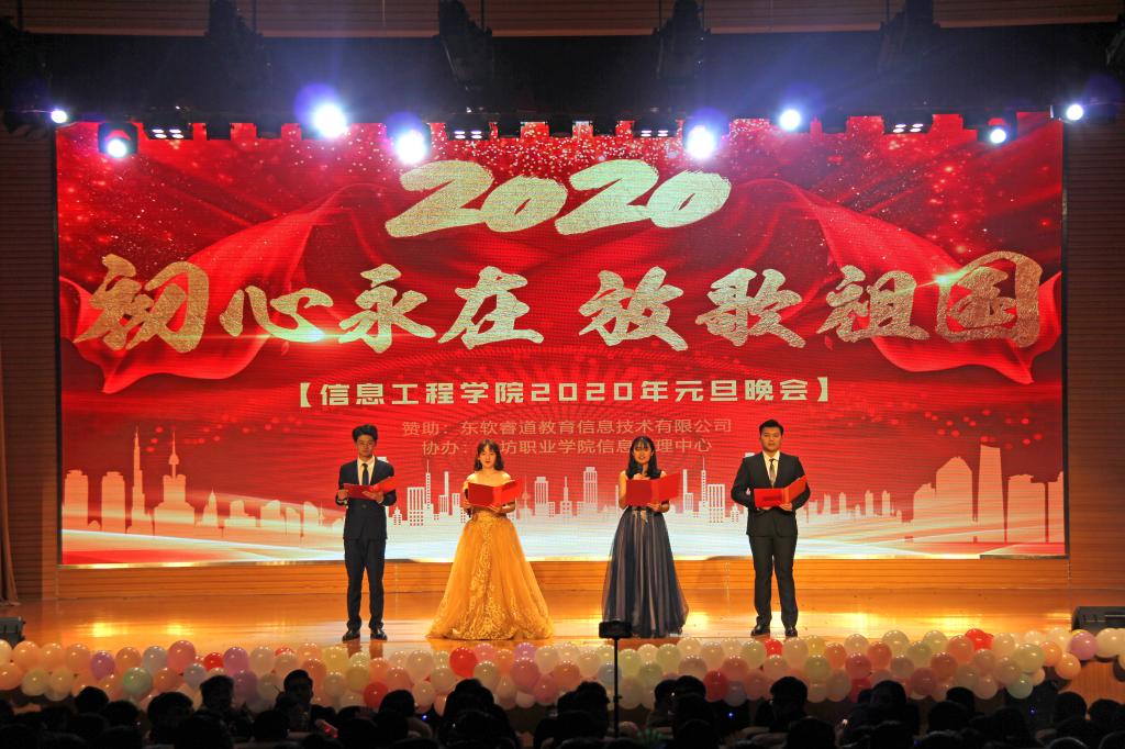 为庆祝元旦佳节,丰富校园文化生活,给同学们一个展示自我风采和勇气的舞台,信息工程学院于12月30日举办“初心永在,放歌祖国”元旦晚会。各职能部门及二级学院负责同志与信息工程学院全体师生欢聚一堂,共迎2020年的到来。
