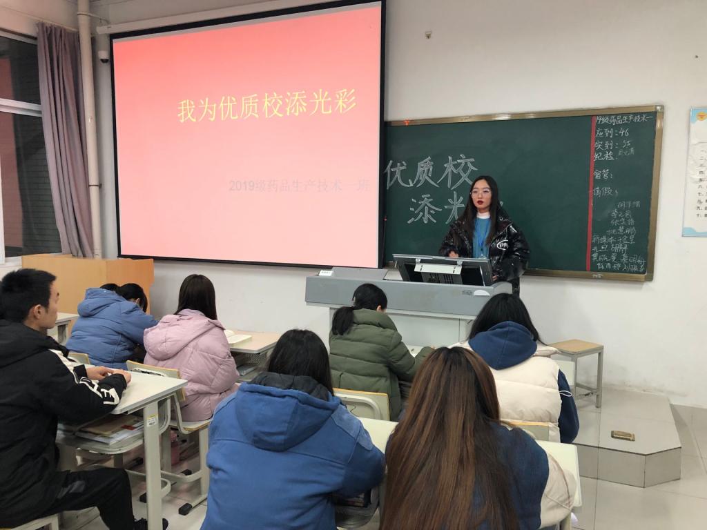 为了激励广大学生积极投身优质校建设,为学院增光添彩,同时展现食品药品学院学生的良好精神风貌,提高学生对学院的认同感、荣誉感和自豪感,食品药品学院团总支于12月8日晚自习期间组织各团支部开展了以“我为优质校添光彩”为主题的团课。