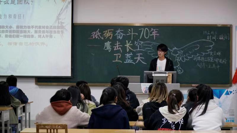 为庆祝中华人民共和国空军成立70周年,加强学生爱国主义教育, 11月14日,信息工程学院组织开展“砥砺奋飞七十年,鹰击长空卫蓝天”主题团课活动。本次活动面向全体学生,以班级为单位进行。