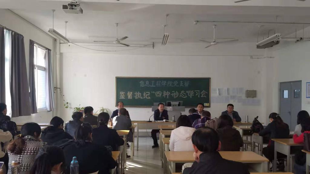 11月14日下午,信息工程学院党支部在惠泽2#412组织监督执纪“四种形态”学习会,全体党员参加,会议由党支部书记主持。