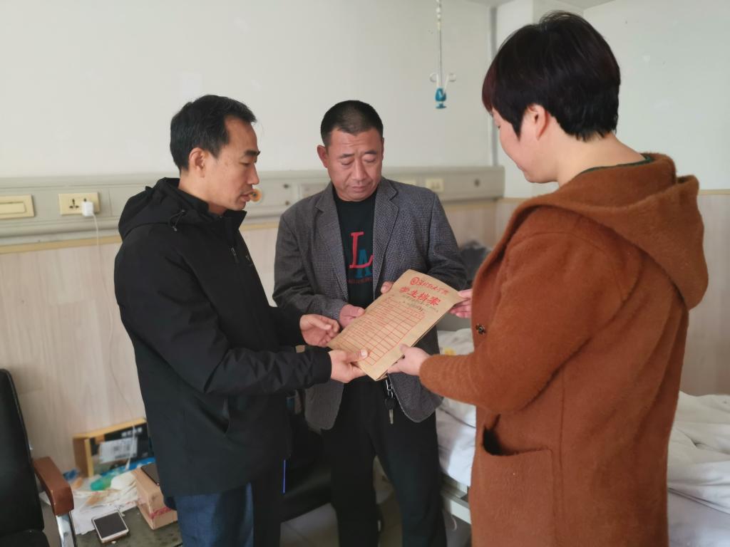 10月29日上午,经营管理学院党支部主要负责同志、辅导员办公室(团总支)老师以及学生班主任老师前往诸城市中医院看望身患重病的必赢18级学生王永青同学,并将凝聚着全院教师爱心的14899.5元的捐款交给王永青同学家长。