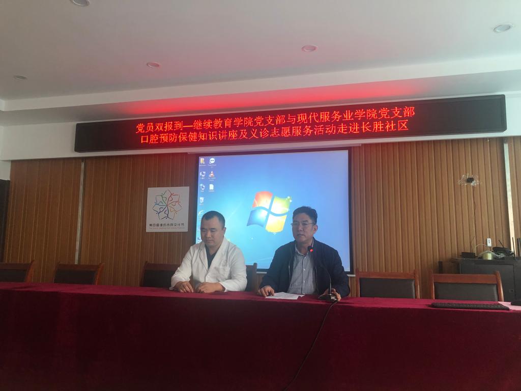 10月22日,继续教育学院党支部和现代服务业学院党支部联合专业口腔医院的专业医师,走进潍城区长胜社区,开展以“传知识,习关爱”为主题的口腔预防保健知识讲座及义诊志愿服务活动。