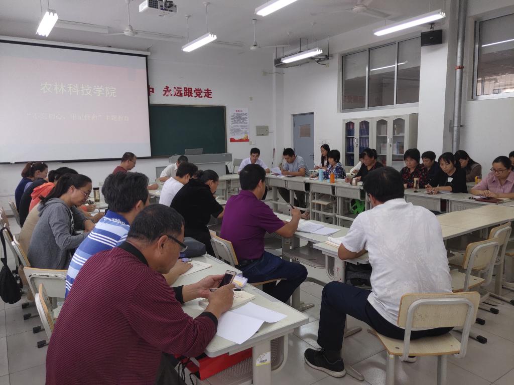9月19日下午,根据“不忘初心、牢记使命”主题教育学习计划安排,农林科技学院党支部在惠泽楼1B-318组织支部全体党员干部进行了集中学习,学院活动指导员参加会议。