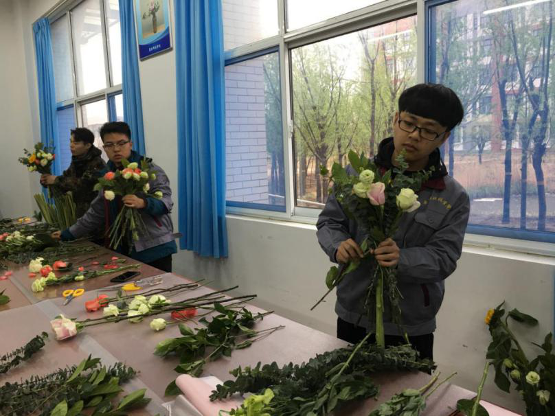 竞赛要求选手在规定时间内利用现场提供的花材完成一个圆形花束。比赛过程中学生操作有序,多姿多彩的鲜花在他们灵巧的双手下,变成一个个匠心独具的美丽花束。经过评委打分,选出一等奖1名、二等奖2名,三等奖3名。