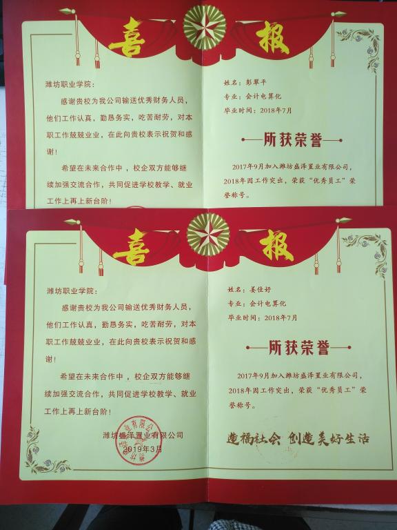 3月25日,山东盛泽置业有限公司送来喜报,经营管理学院会计专业2名毕业生荣获山东盛泽置业有限公司2018年度 “优秀员工”荣誉称号。