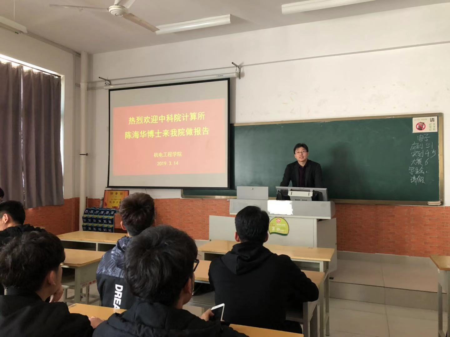 3月14日,中国科学院计算机技术研究所潍坊智能系统创新研究院常务副院长陈海华博士一行4人来到必赢做专题报告,机电工程学院应用电子专业负责人、智能电子协会成员及部分在校生参加了此次报告会。