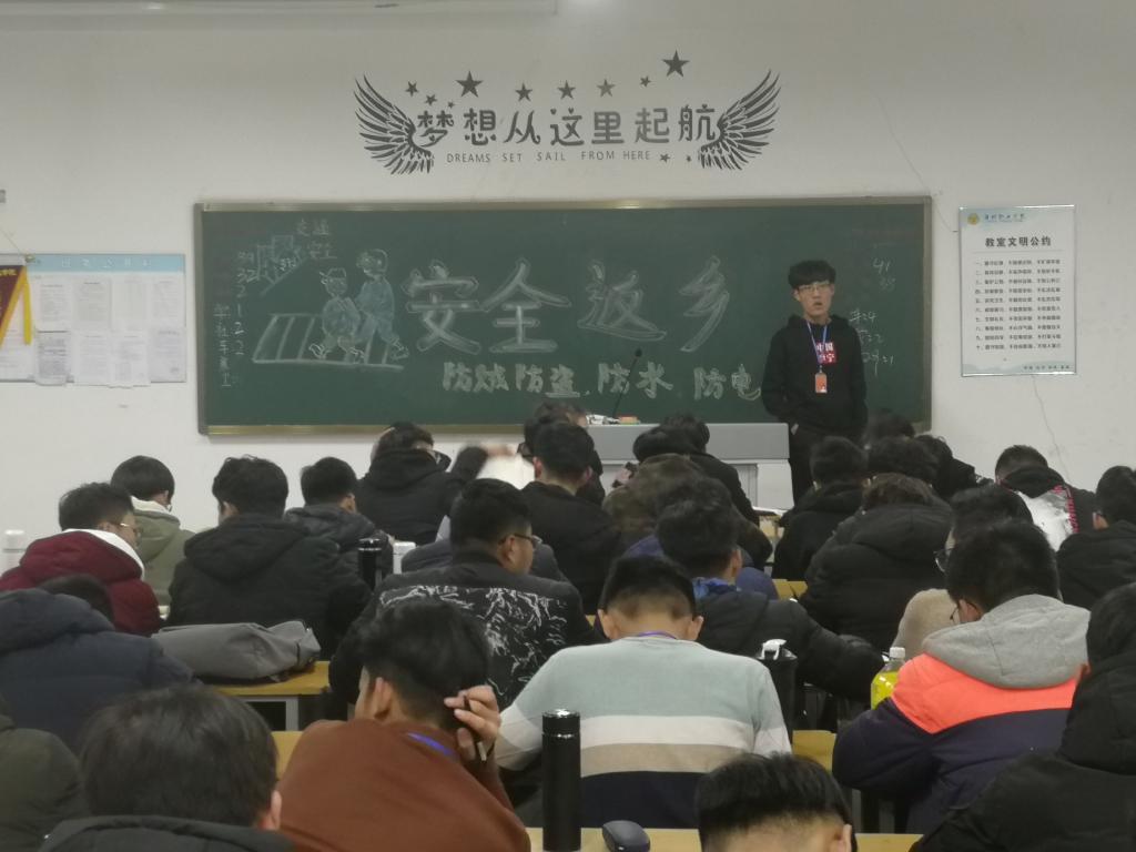 为教育同学们将安全牢记于心,加强同学们对交通安全、饮食安全的了解,增强学生珍爱生命的安全意识,提高学生的自救防范能力,汽车工程学院于12月27日在惠泽2号楼b区举行了元旦假期安全返乡主题班会。