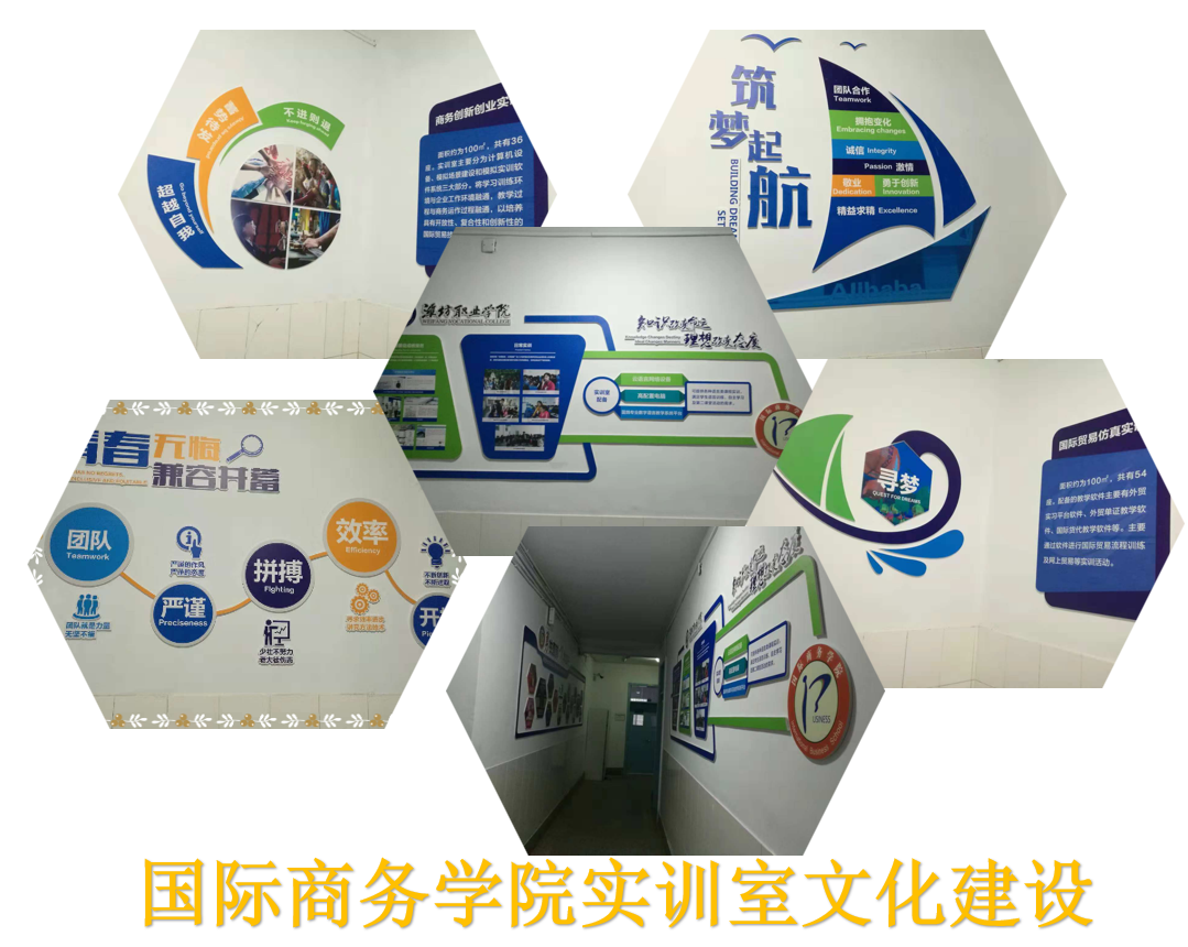 以“文化、礼仪、和谐”为主线的走廊文化设计,体现了商务、服务类专业群特点,注重培养学生的文化底蕴,教会学生知礼、懂礼、讲礼,达到“德”文化内化于心,外化于行的培养效果;实训室文化建设是校园文化建设的重要组成部分,是学院办学特色的具体体现,以“筑梦、寻梦、逐梦、圆梦”四个梦为主线,营造了学风淳、教风严、作风正的良好氛围,旨在培养高素质技能型人才;班级文化建设则以专业大类为主线,以“一带一路”沿线国家及英、美、法、韩等世界发达国家的教育、文化、旅游等为背景,同学们仿佛置身于联合国的环境中,享受着专业文化的熏陶。