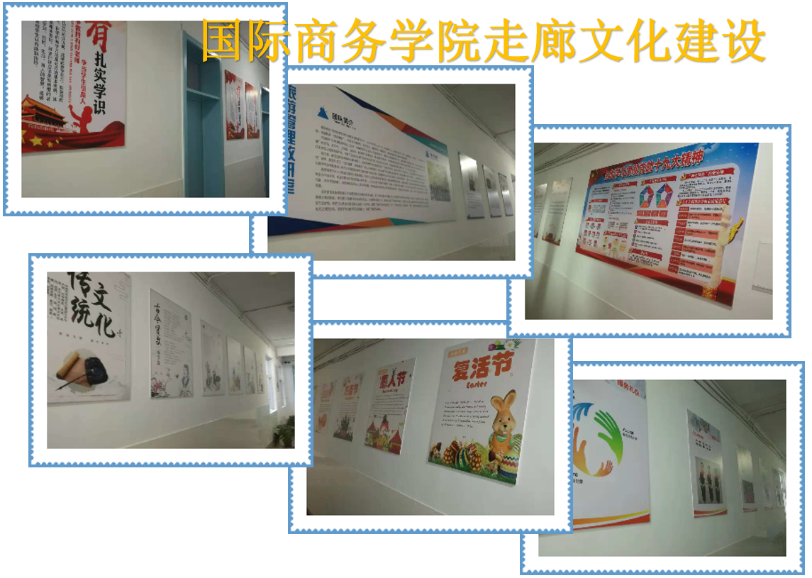 国际商务学院一直本着“不重更重”的理念全力推进优质校建设,为营造以“德”育人的文化育人氛围,国际商务学院成立文化建设工作小组,由主要负责人任组长,分管负责人任副组长,各科室负责人任成员,统一调度,分头行动,历时近两个月,把1号楼装扮一新,整个楼内充满了浓浓的文化气息。