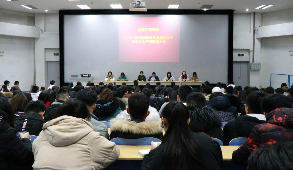 11月27日下午,信息工程学院在惠泽2号楼报告厅举行了2018-2019学年学生会成立大会暨学生干部培训会。该院分管学生工作负责人、辅导员班主任及新一届学生会全体成员参加了本次大会。