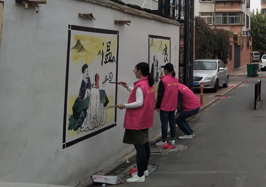 志愿者在老师的带领下来到潍城区颐园社区进行墙绘,受到了社区居民的热情接待。志愿者们在认真听取社区负责人的意见与要求后,确定了以“仁义礼智信,温良恭俭让”传统文化为主题。接下来,大家迅速换好工作服,准备好工具,分工开始工作,有的负责绘图勾边,有的负责调色上色。经过近2天的努力,一幅幅墙绘作品跃然眼前,彩绘的“不忘初心、牢记使命”“砥砺前行,团结奋进”等字样和画面,为社区增添了一道文明风景。社区工作人员和居民参观后,对志愿者们的劳动成果十分满意。