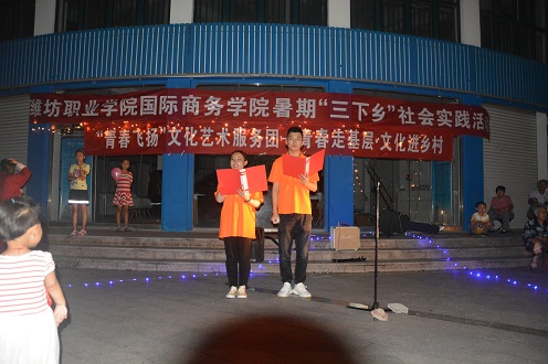 由辅导员老师的带领的“青春飞扬”文化艺术服务团队,在7月12日抵达昌邑县开展了为期六天的文艺汇演、走访党员、社会调查等活动。