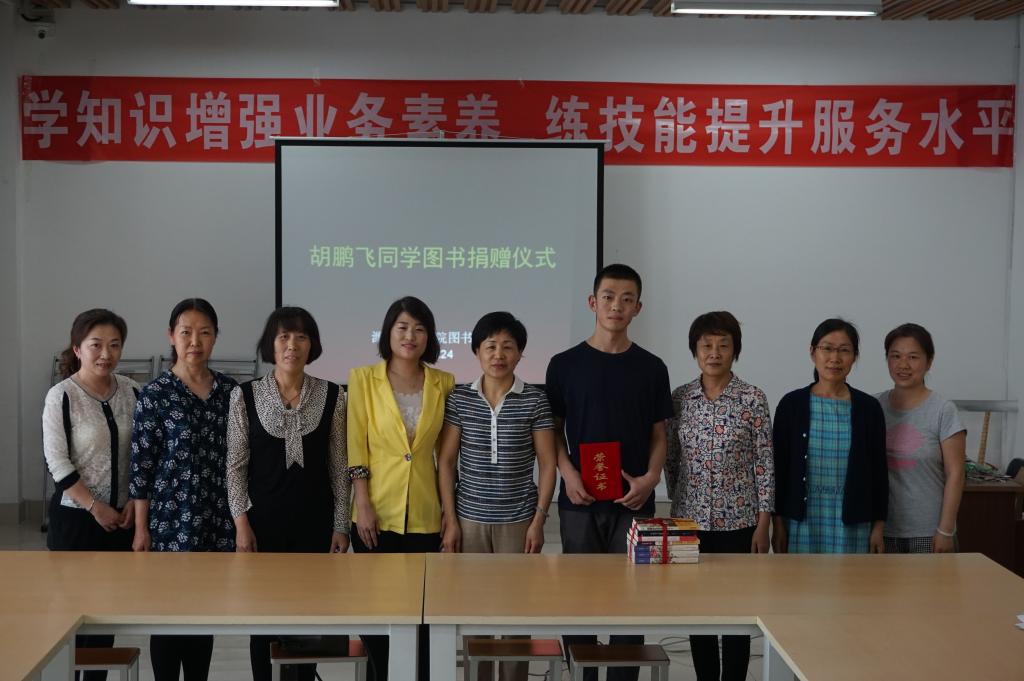 5月24日,“胡鹏飞同学图书捐赠仪式”在必赢图书馆举行,图书馆主要负责同志、科室负责人、胡鹏飞同学的班主任、采编部全体老师及部分学生代表参加了仪式。