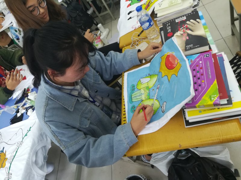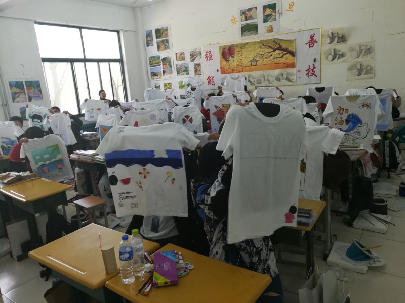 比赛采取现场在白色T恤衫上绘画的形式,创作主题为“缤纷夏日”,紧张的比赛过程中,同学们首先绘制草图,在纸上画出小稿,待搭配出合适颜色,再将丙烯颜料画在提前准备好的白色T恤衫上。赛场上,同学们熟练的搭配色彩,绘制出五颜六色的图案,或抽象,或具象,画出了自己心中的“缤纷夏日”。经过激烈的角逐,最终评选出一等奖8名,二等奖10名,三等奖15名。(卢婷婷供稿)