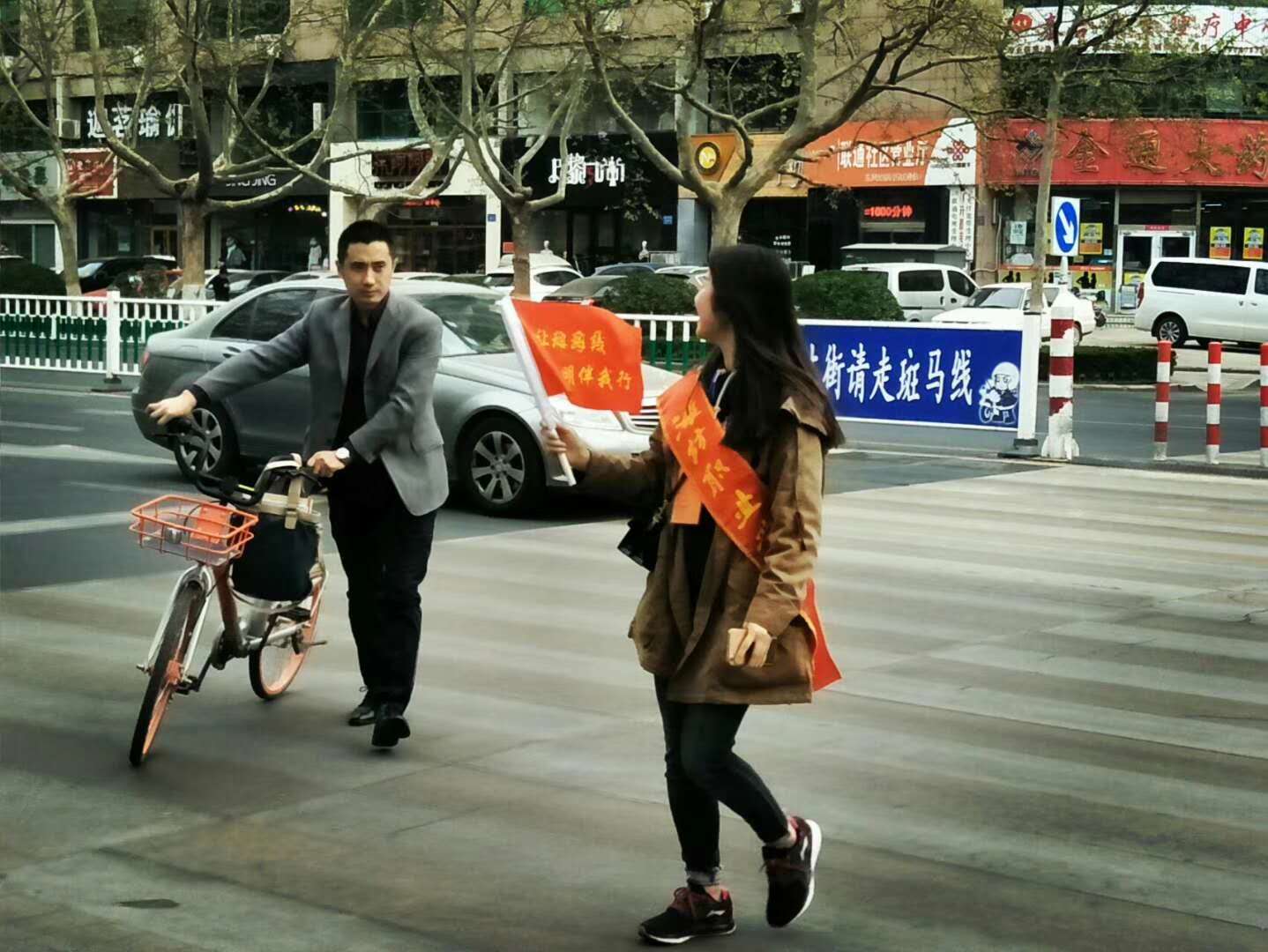 同学们身披志愿者绶带,手拿“文明城市,从我做起”红色小旗,在东风东街与公安巷的交叉口,引导广大机动车驾驶员在道路斑马线处减速慢行或停车避让,礼让行人优先通过。同时引导行人按照红绿灯指示行走,过马路走斑马线,不横穿马路,不翻跨护栏。