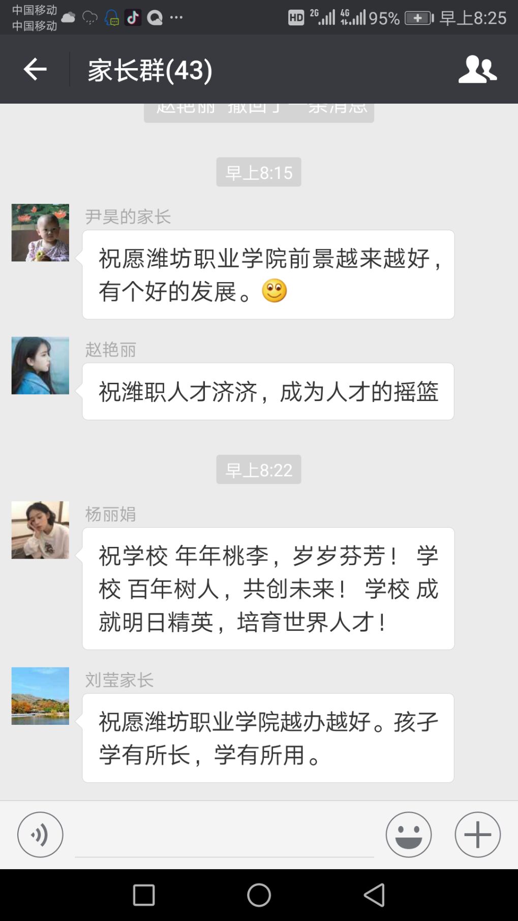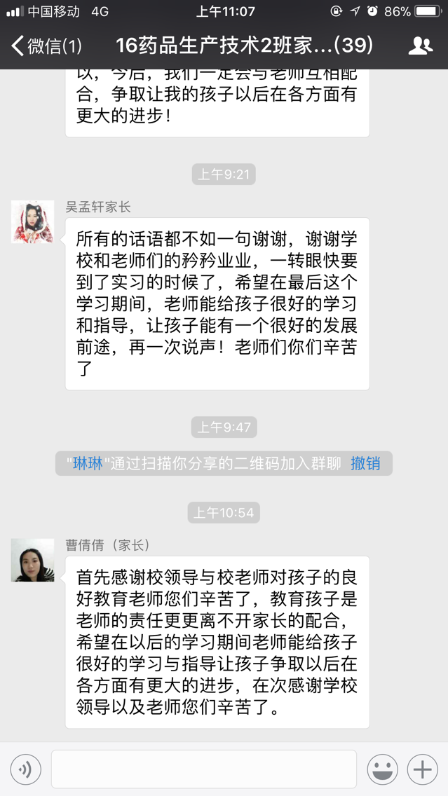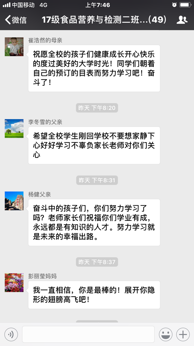 从征集的家长寄语中可以看出,家长们对孩子都抱有很大的期望,希望他们能够健康成长并有一个好的将来,同时,家长们也对学校和老师表示诚挚的感谢,谢谢老师们的辛苦付出。“心连心,共育人”工程从寒假建立微信圈开始到家长寄语征集活动结束为止已初见成效,家长们通过微信圈能及时与班主任老师交流沟通,了解孩子在学校的近况,班主任老师也能通过微信圈向家长了解一些学生在家中的表现,架起了家校沟通的桥梁,强化了学院—家长—学生三方互通互联,真正达到家校一体心连心,三方互动共育人的效果。(孙术森供稿)