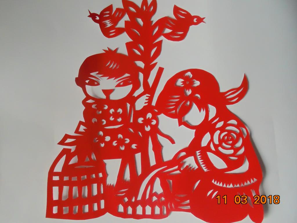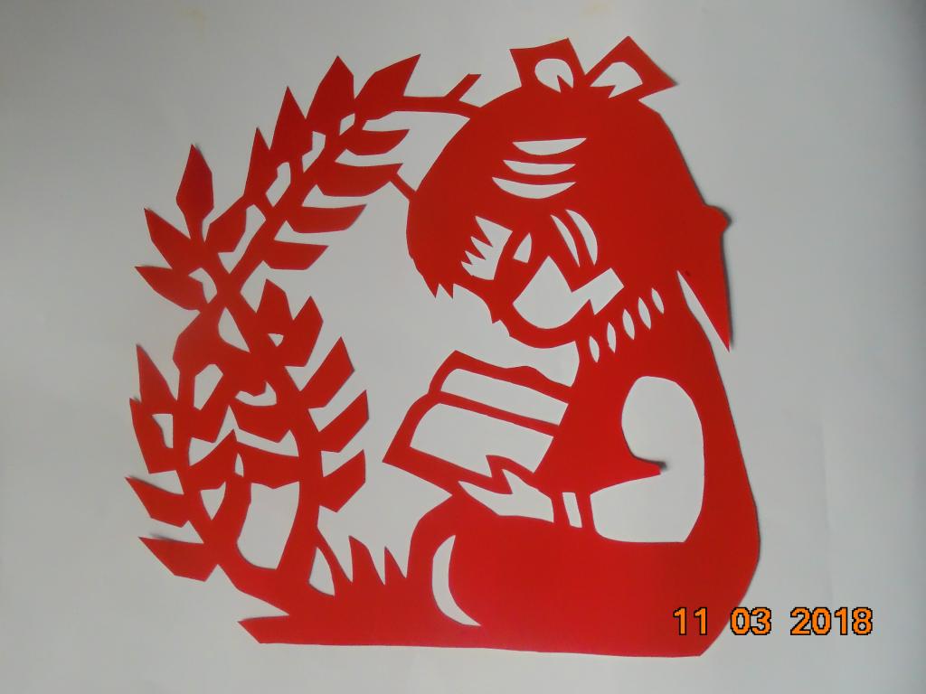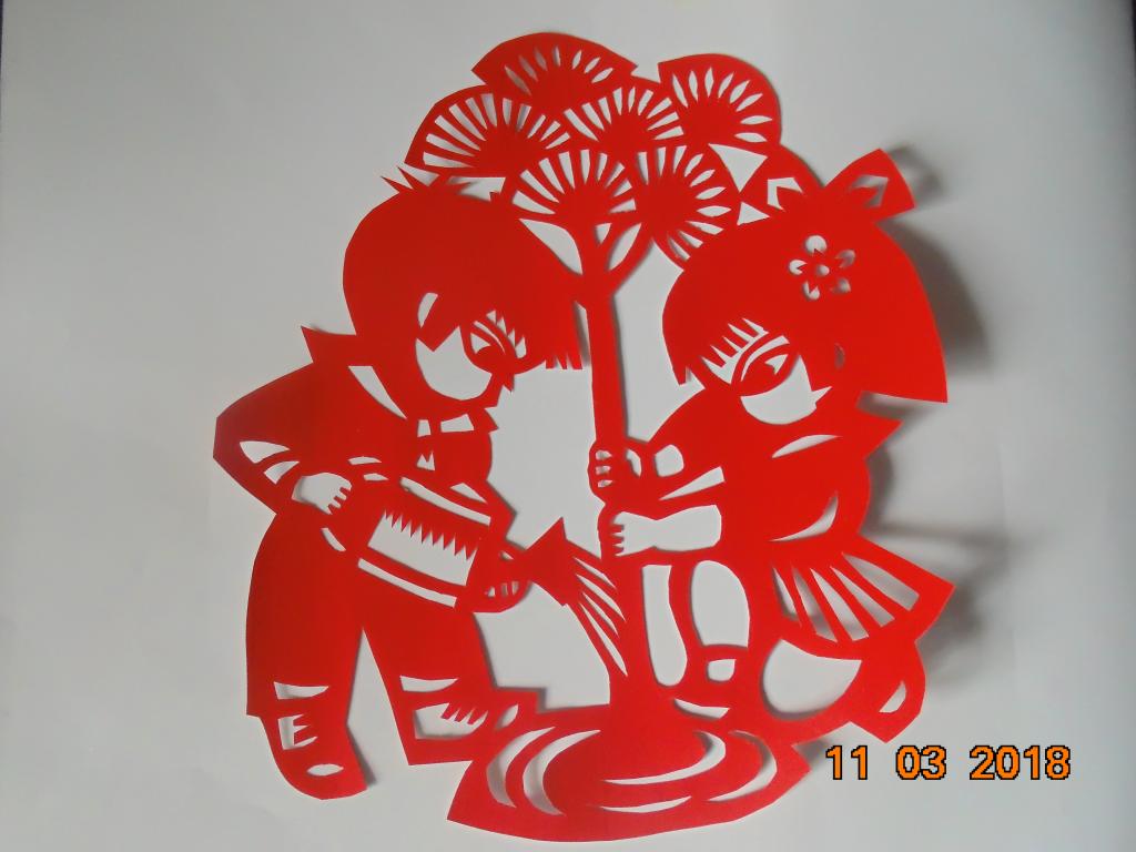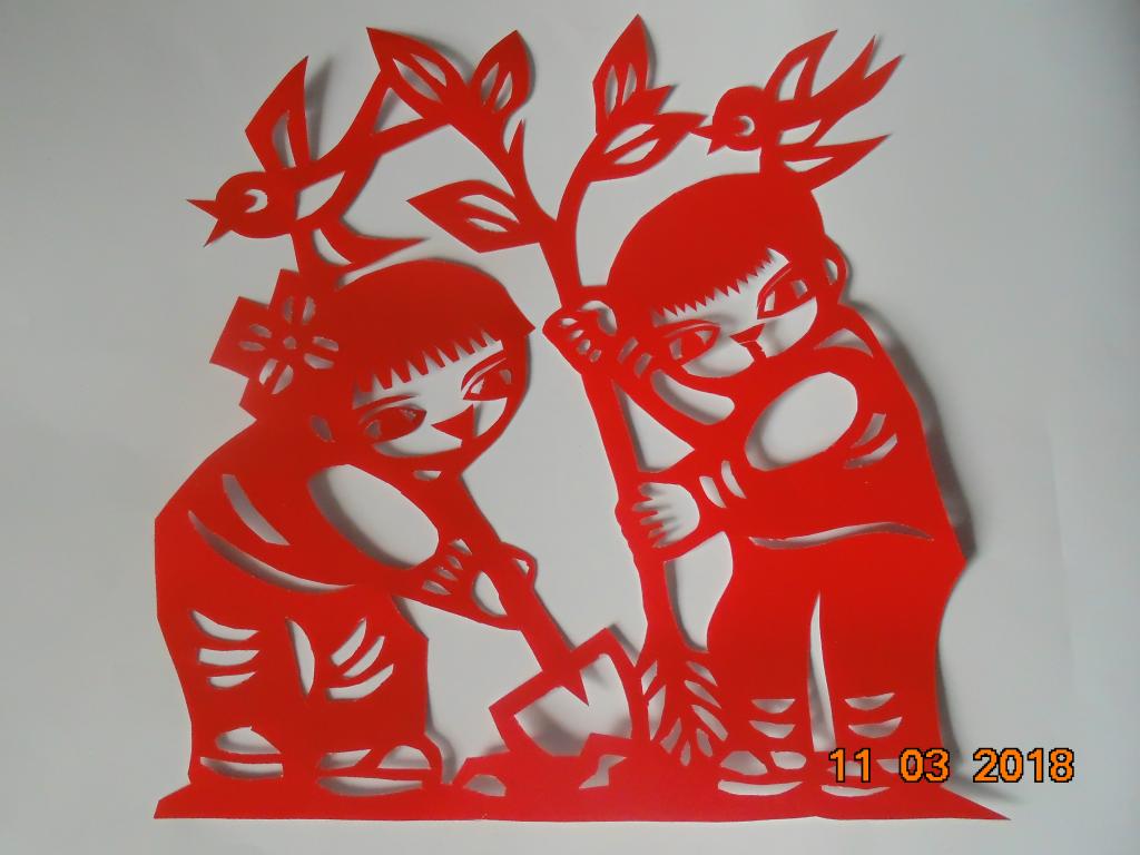 在剪纸教师的指导下,同学们以剪纸知识为基础,精心刻画剪纸图形,积极进行剪纸创作。一把剪刀,一张红纸,在同学们的手中不停地舞动,一幅幅精美的作品便展现在我们面前:茁壮成长的树苗,活灵活现的小鸟,惟妙惟肖的人物,跃然在纸上。学生将传统剪纸艺术活动与时代要求相结合,主动以创新的形式参与到宣传保护树木的活动中去。