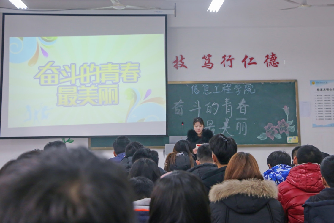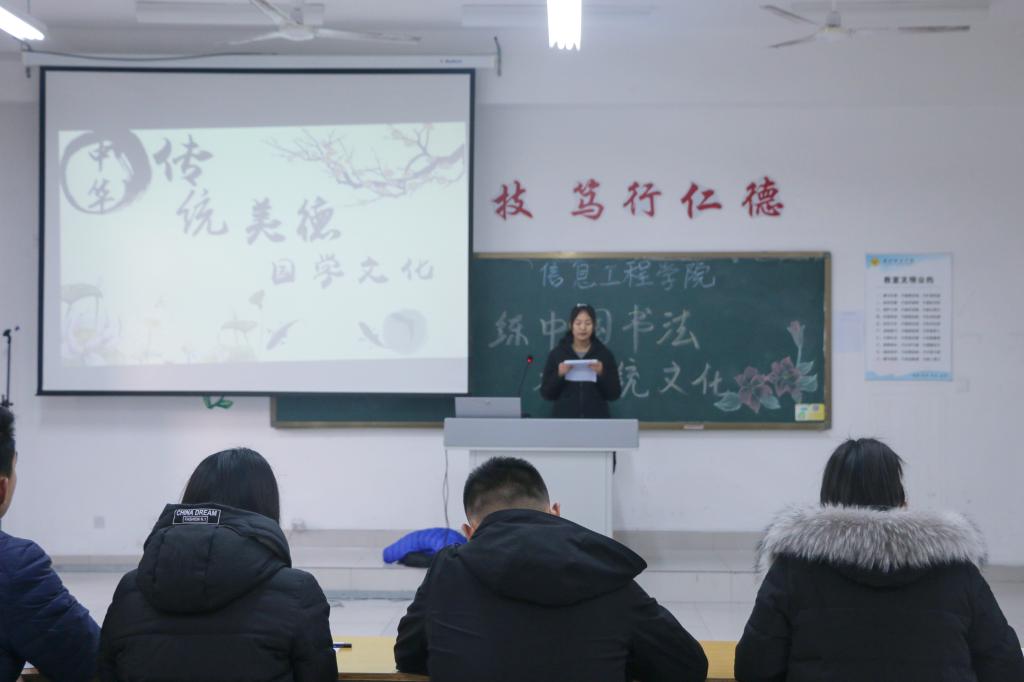 信息工程学院“1+1”自主学习活动由1项必选项目和1项自选项目构成,其中,必选项目包括书法和演讲口才两项,自选项目包括礼仪、舞蹈、相声、合唱团、乐器等共二十五项,学生从必选项目和自选项目中分别选取一项利用自习时间和课余时间进行练习活动。1月15日以来,信息工程学院组织各班级分别以“奋斗的青春最美丽”演讲比赛和“练中国书法 承传统文化”书法展示比赛的形式对必选项目进行了考核总结,组织各自选项目导师根据项目特点结合日常活动开展情况进行了考核总结,并将每名同学的考核成绩计入个人综合素质测评。